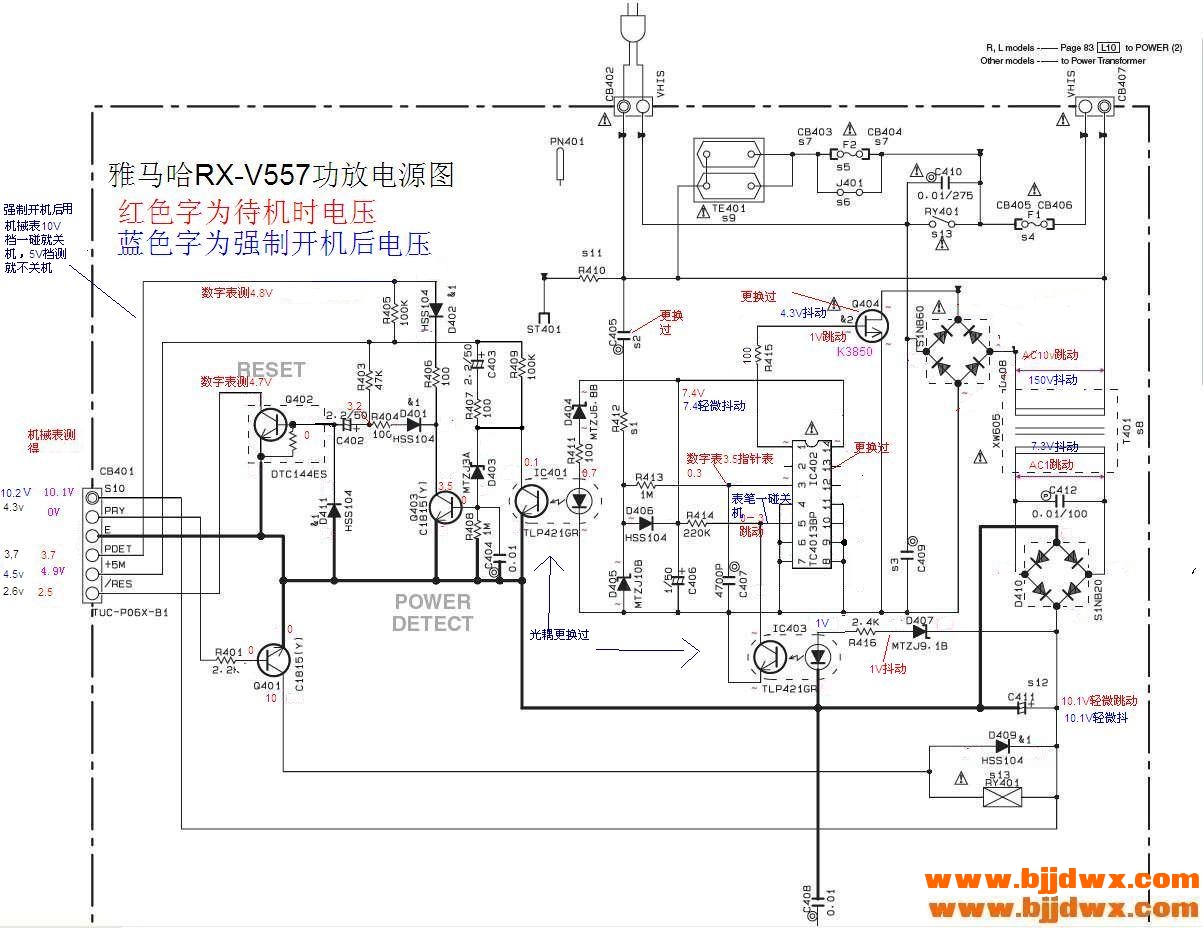 一台RX-V557是三无故障,无任何反应,已修过电源,更换C4开路(223J),Q6击穿(2SK3850),IC3内部短路(TC4130),更换之后开机1秒关机,同时按面INPUT    MODE加MULTICHINPRU再的按开机键3秒,进了工厂模式不不再关机,自检显示PS  PRT   :098   K      接通音源能放大,测+5M(4.9V),RES(3V,数字表测4.7V.),PDET(3V,数字表测4.8V),S10(10V,数字表测10.1V),强制开机久了T401变压器有点烫,,求大神指导