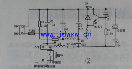 接通电源,测C1两端电压为0,断电后测C1两端电阻为0Ω,断定电源板主变换电路有短路故障。在路检测,发现保险管F1断路,整流二极管DLD2和场效应开关管Q3击穿。拆下Q3后再测,C1两端电阻仍为0Ω,经查DW1、DW2已击穿。更换D1,D2、Q3、DW1,DW2,在F1两端焊接一只60W/220V白炽灯泡,此时接通电源,灯泡闪亮一下即熄灭,风扇开始运转,压电陶瓷片上方水面喷出水柱,转动雾量调节电位器,水柱上方雾化,证明故障己排除。拆下白炽灯泡,换上保险管Fl,交付使用。