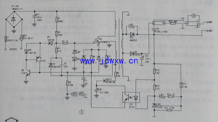 分析检修:查水槽内压电陶瓷换能器表面无过多污垢。接通电源后,上下移动水位检测磁环,加湿器无反应,昕不到风扇转动声音,判断加湿器电源板有故障。拆下加湿器底座,上电后测量电源板输出电压均为0,确认电源板确有故障。该电源电路如图1所示。