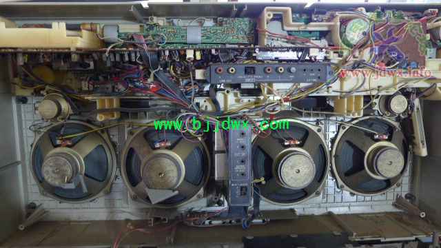 至于喇叭,中间的两个喇叭是“super woofer speker”(超重低音喇叭,见图)很好的喇叭!防尘罩脱落,经过仔细清理后用玻璃胶小心粘好,从黑色的金属网罩里看进去,贼亮贼亮的!其它喇叭全都原装且外观和性能完好。