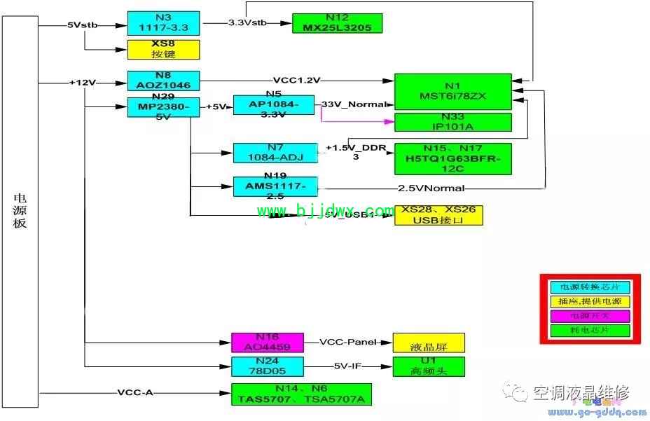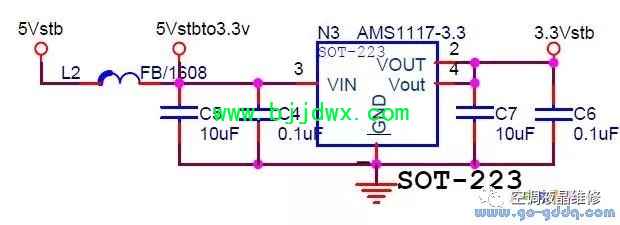 海信LED42K11P(MST6i78机芯)液晶彩电电源系统之3.3Vstb电路 3.3Vstb为待机3.3V,通过待机5V转换而来,待机不受控。用于系统的PM供电、MbootFLASH供电、触摸按键供电等。此电压不正常会造成整机不启动。