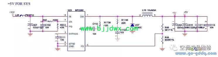 海信LED42K11P(MST6i78机芯)液晶彩电电源系统之+5V电路 +5V为系统主5V,待机受控,设计容量为5A。LED产品中电源板无+5V输出,需要主板通过DC-DC转换而来。用于系统+2.5V_Normal、33V_Normal、USB5V等。