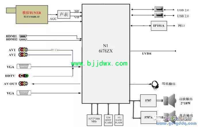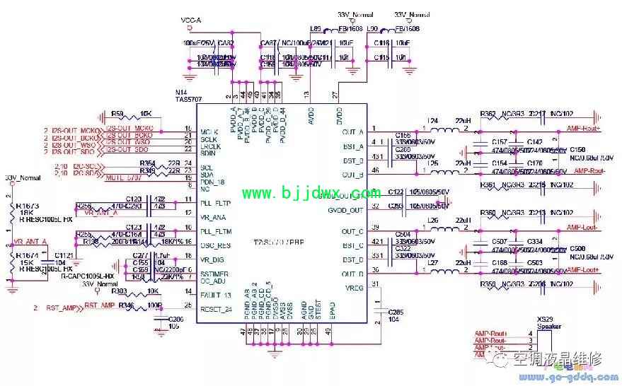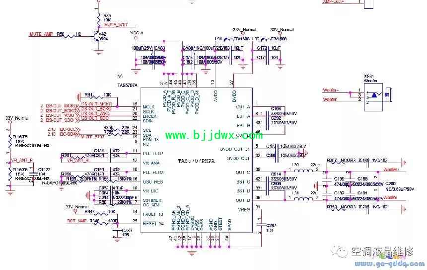 海信LED42K11P(MST6i78机芯)液晶彩电之重低音电路 重低音采用N6/5707A,5707A和5707的外围电路完全一样,仅I2C地址不同。通过设置5707A内部的低通滤波参数,可以实现低通重低音。