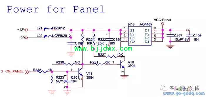 海信LED42K11P(MST6i78机芯)液晶彩电电源系统之液晶屏TCON供电电路 液晶屏的TCON供电采用最常用的MOS管切换电路,实现TCON供电的切换控制和输入电源选择。如果此部分电路出故障,如N16损坏,会导致液晶屏无输出,现象表现为黑屏或灰屏(背光亮的时候),或者有音无图。