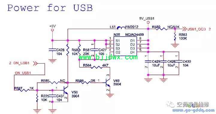 海信LED42K11P(MST6i78机芯)液晶彩电电源系统之USB供电电路 因LED产品的+5V通过DC-DC转换而来,DC-DC本身有过流保护电路,本机型N35不再使用,L51焊接为磁珠。
