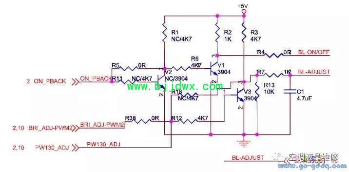 海信LED42K11P(MST6i78机芯)液晶彩电之背光ON/OFF和调光电路 采用了通用的背光控制(BL-ON/OFF)电路和调光电路(BL-ADJUST)。调光方式由液晶屏决定,直流调光时C1位4.7uF;交流/PWM调光:C1为NC。直流调光的系统如果C1没有焊接,会造成BL-ADJUST电压不稳,造成屏闪故障。直流调光电压过高或者过低、调光频率和脉宽设置不合适也会造成屏闪动、黑屏等故障。