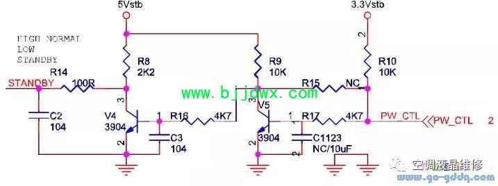 海信LED42K11P(MST6i78机芯)液晶彩电之待机控制电路 待机控制采用两级反向的方式,上电时MST6i98ZX的控制管脚PW_CTL默认为高阻状态,这样V5的控制端B为高电平,两级反向后standby为高,电源启动,输出+12V,系统启动。系统启动后根据EEPROM中读取到的待机状态再来控制PM_CTL,从而控制整机是出于开机状态还是待机状态。