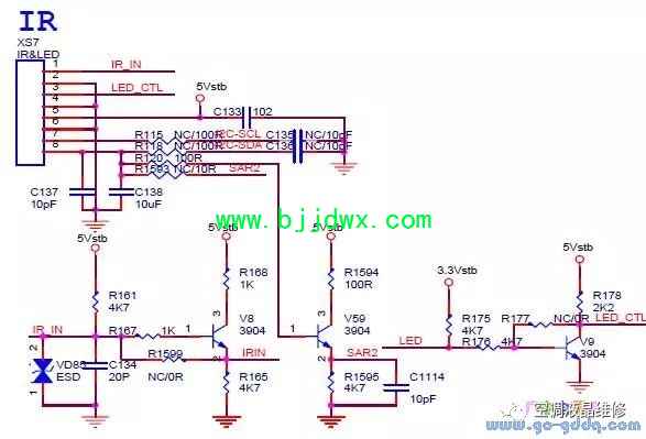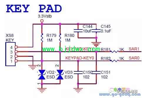 海信LED42K11P(MST6i78机芯)液晶彩电之按键电路 触摸按键:XS8为4PIN;R179、R180为1M;