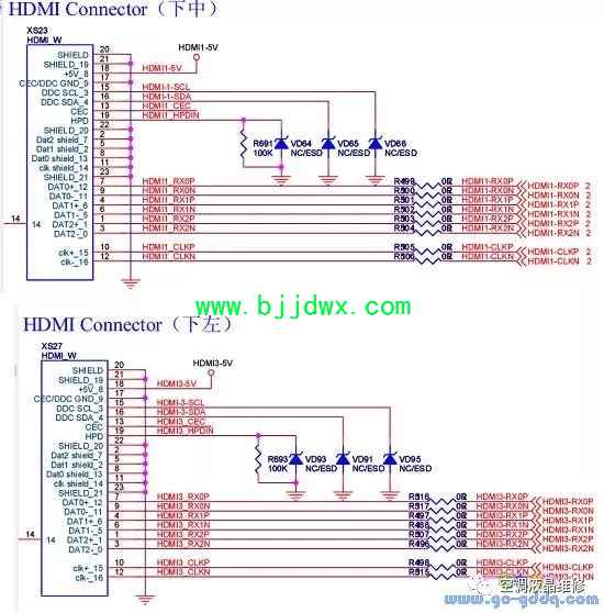 海信LED42K11P(MST6i78机芯)液晶彩电之HDMI接口电路 MST6i78支持4路HDMI输入,EDID采用程序内置的方式。同时MST6i78的ESD能力很强,所以HDMI接口附近的ESD器件也不需要贴装。