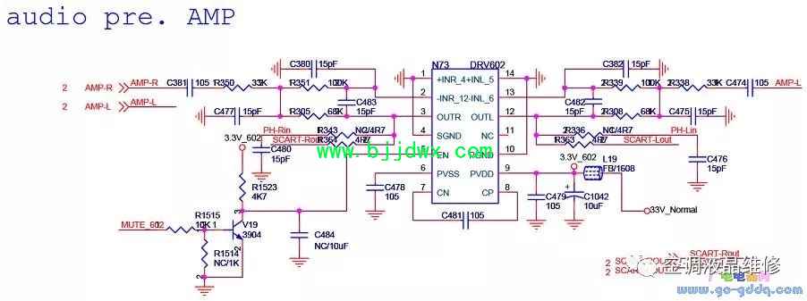海信LED42K11P(MST6i78机芯)液晶彩电之音频输出电路 音频输出没有采用常规的射随电路,采用带静音控制的集成电路DRV602,可以实现AV输出的开关机静音。主要是为配soundbar使用。