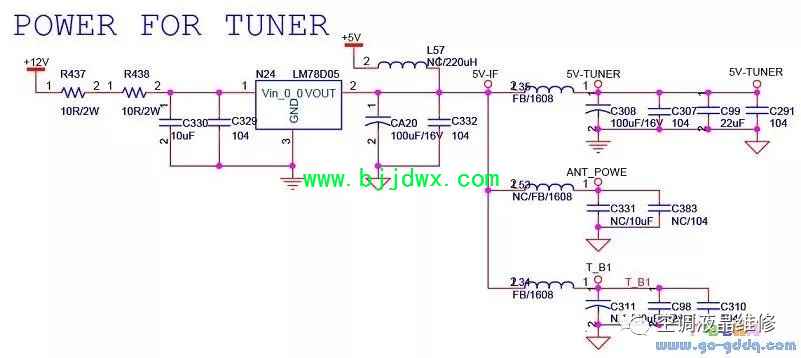 海信LED42K11P(MST6i78机芯)液晶彩电之tuner部分电路 12V经过10R/2W的电阻分压后给N24,通过线形稳压器N24产生5V-IF电源,作为tuner的供电