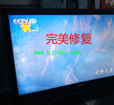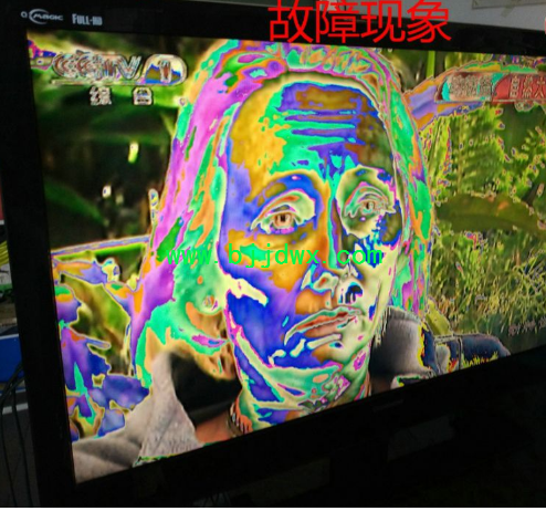 上门看电视确实是花屏,而且出现花图像后图像消失几秒接着再出现花屏图像,一直在闪屏,看图像怀疑是数据问题(下有故障照片),看旁边放的万能电视遥控器更加坚信是数据问题!给用户说“看样子二三百可以修好,要把电视拿到店里面修,具体价格拆机检查后再打电话”。用户同意后直接拖回。