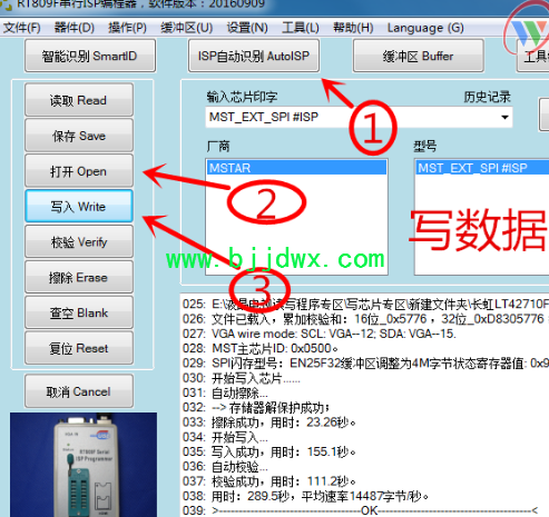 写数据前先备份原机数据,经测试此机可以用RT809编程器VGA口在线读写数据和打印信息(有些机型可能要用其它方法或拆存储器读写),读写数据也就方便多了!备份原机程序步骤:电脑接 编程器和电视主板用VGA线连接,电视开机后打开软件,点软件上自动识别----读取---填写电视型号---保存程序。