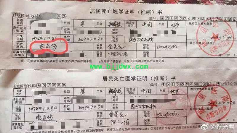 金美花丈夫的死亡医学证明书显示死因为“电击伤”