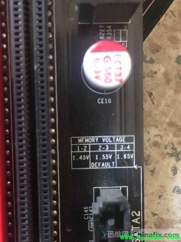 测试没有时钟复位,没有CPU供电,其余电压正常,刷个BIOS能跑码但是还是会掉电重启。肯定是细节方面出了问题,拔掉内存条能报警不重启了。看来是内存电路有问题,实测内存供电1.55V有点偏高,发现主板上面有个跳线
