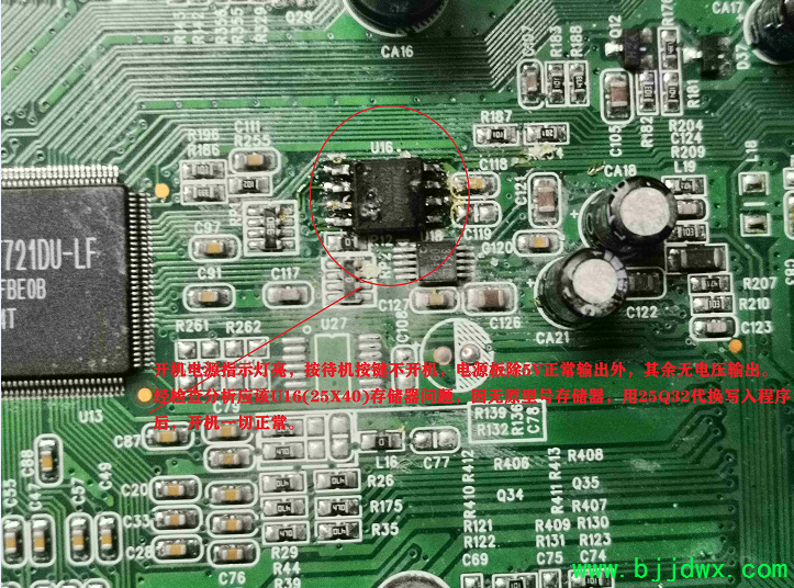 经检查是U16(25X40)程序问题,因无25X40,用25Q32代换写入程序后,开机正常,维修结束。