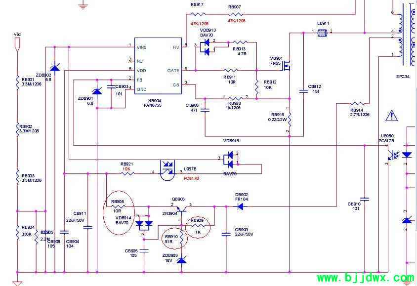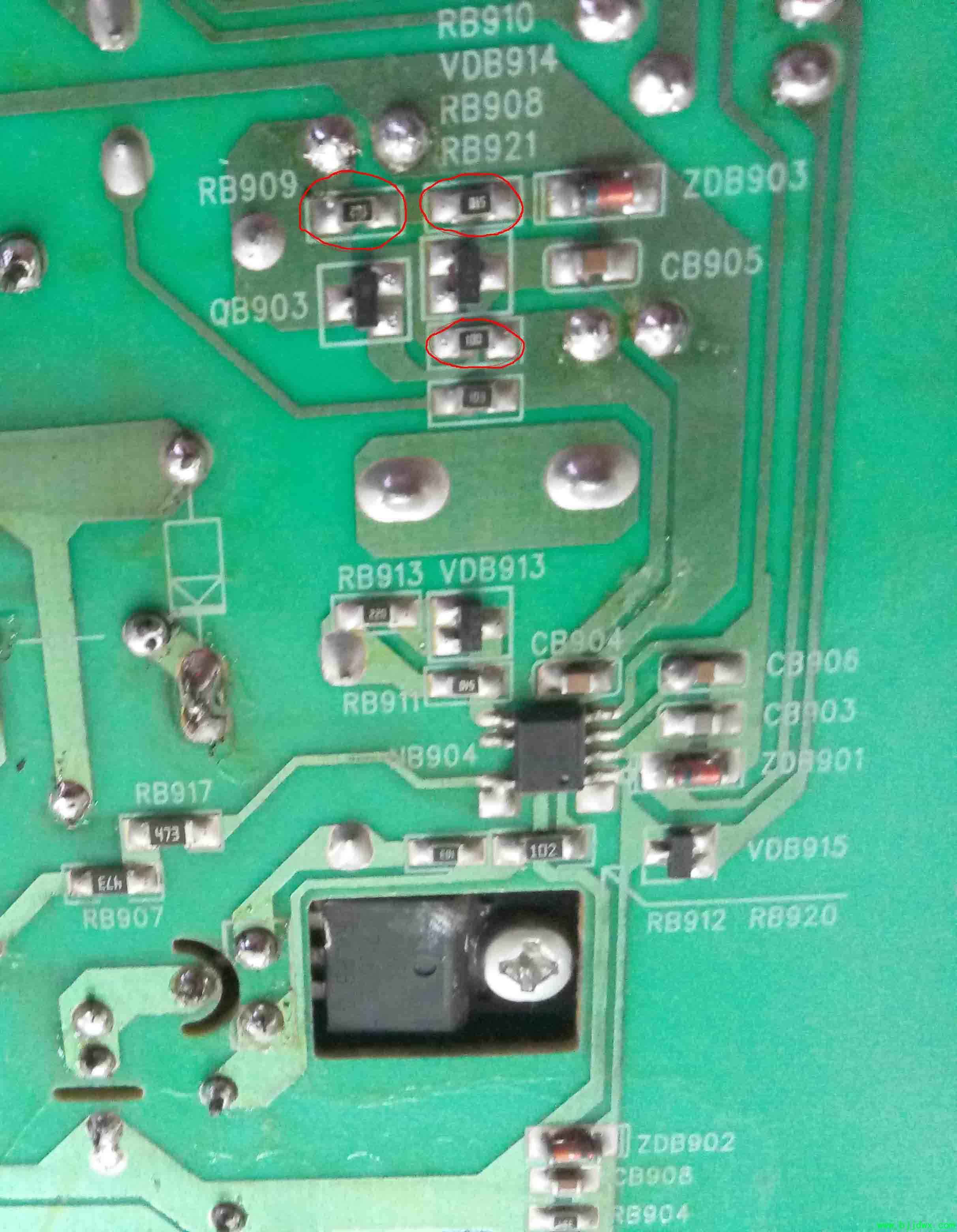 顾客拿来机器交流通电,指示灯红灯一闪就灭了,然后三无。开机测了电源板上的12V有,但是有轻微抖动,没有在意。继续测了主板输出的开机电压3.3v有,主板输出的开背光的电压0v ,怀疑主板坏了,测了主板上的3.3V 2.5V 1.6V 都有,然后刷程序,故障不变。网购主板换上故障不变。排除主板故障,开始检修电源,摘板测了12V仅剩6V倒8v的抖动电压,电压低是没有接开机电压的原因,但是不能打嗝哦,打嗝故障必须先排除。 换431 光耦 主芯片6755 以及周围电解电容大面积补焊无果。还是得通过原理图找故障,最后测试原因是坏了三个电阻 就是RB909 图纸标注1K 变成了13K  RB901 51欧姆断路,RB908 10欧姆断路。至此根源找到,换了电阻一切正常。