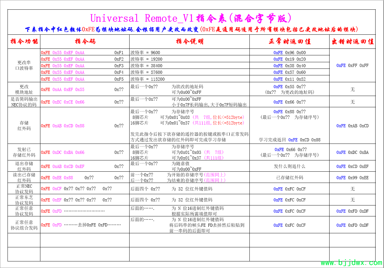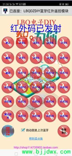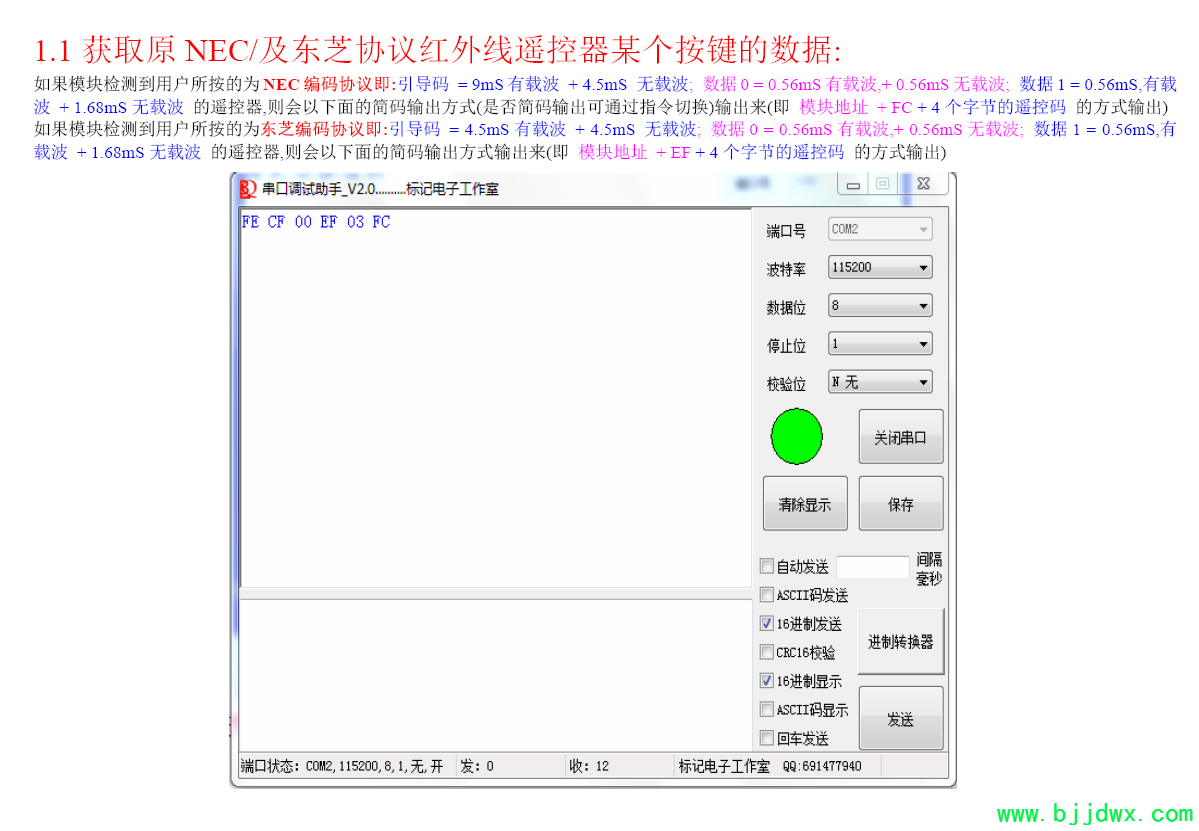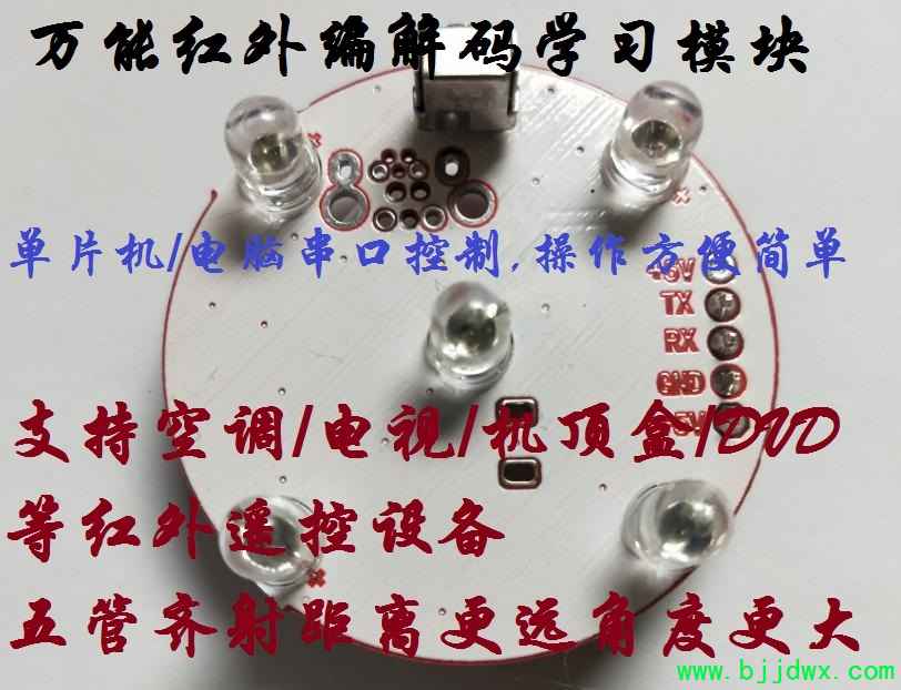 | 使用芯片为 STC8F1K08/STC8F2K08S2等兼容芯片即可,内振 11.0592Mhz 串口波特率 115200 可收1000个码位 一、功能说明 1、具备红外发射功能。 2、具备红外编码功能。 3、具备红外码存储功能。 4、具备更改通信波特率,模块地址号功能。 5、可控制红外格式设备, 格力、美的 及其他品牌空调 、电视机、电风扇等电子电器设备。 6、支持编码芯片:(典型NEC编码芯片如 uPD6121, uPD6122, 东芝TC9012 以及众多 的兼容芯 片型号,如 PT2221, PT2222, SC6121, SC6122, SC9012 、格力、美的 空调 等等) 二、应用范围 智能家居 学生电子设计 红外转无线 智能工控设备 MP3控制器 远程红外控制 红外解码设备 电子积木套件 电子设备控制 无线转红外设计 红外编码设备 智能小车遥控 三、使用方法 本模块的使用方法非常简单,只要给模块供上3.3~5伏电源,及手机安装本店提供的APK,或电脑串口助手即可按步就班操作。 使用说明及例程链接:https://pan.baidu.com/s/1m2suVmcqo57A9qTwQc2Ofw 提取码:lo1z 用安卓手机按制所有带红外遥控器的家电、设备 一个APP界面可以学习家里所有以38K红外载波编码的任意红外遥控器,再也不用看场电视要拿好几个红外遥控器了。 如:空调、电视、机顶盒、风扇、台灯..........等等,常用的按键学习在手机APP中,从而达到一机在手控制家里的所有家电的目的。 ![]() ![]() ![]() ![]() ![]() ![]() ![]() ![]() ![]() ![]() |