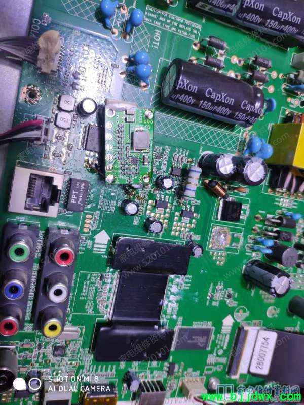 接修康佳LED40F2200NF液晶电视,故障表现为不开机,之前以为是电源故障,因为电视机有时候可以开机,不过开机后屏幕无字符,以为又是电源12降低原因,后来开机检查,发现12正常,而且后来指示灯也不亮了,看来是主芯片不工作,于是测试主板发现N801输出电压2.2V且不稳定,输入电压5V一直正常,之前没有图纸以为它输出电压是3V,结果找到图纸发现它输出的电压应该是1V,看来是输出电压高了,估计这个是缓存电压,于是检查稳压芯片外围取样电阻,结果都是好的,估计是芯片坏了,后来外接一个外能稳压块1.25V电视机修复。