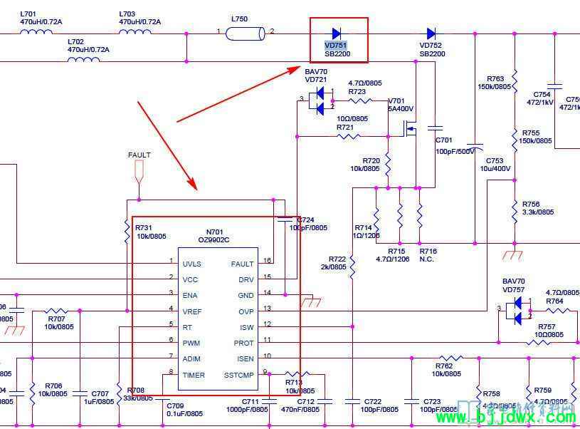 接修一台康佳LED32F2000E液晶电视,故障表现为无背光,首先检查背光电路控制芯片是OZ9902CGN贴片16脚,开机瞬间背光不闪,测LED+端即升压二极管正负端均105伏,判断升压电路没工作,测VD751、V701无短路,测OZ9902CGN供电VCC第2脚12V,第3脚ENA 3V,4脚5V,6脚PWM3V均正常,分析IC工作条件已具备,开机瞬间无升压再查检测电路,IC1脚低压保护为2.5V,查取样电路电阻2.2M,1M,120K阻值正常,电容正常,测13脚OVP端取样电阻R763 150K为0K,另一个150K正常,更换R763试机正常。需提醒的是,网上维修文章说OZ9902CGN的1脚电压要大于3V,否则保护,实际中该脚2.5V是完全可以工作的,并不会保护。