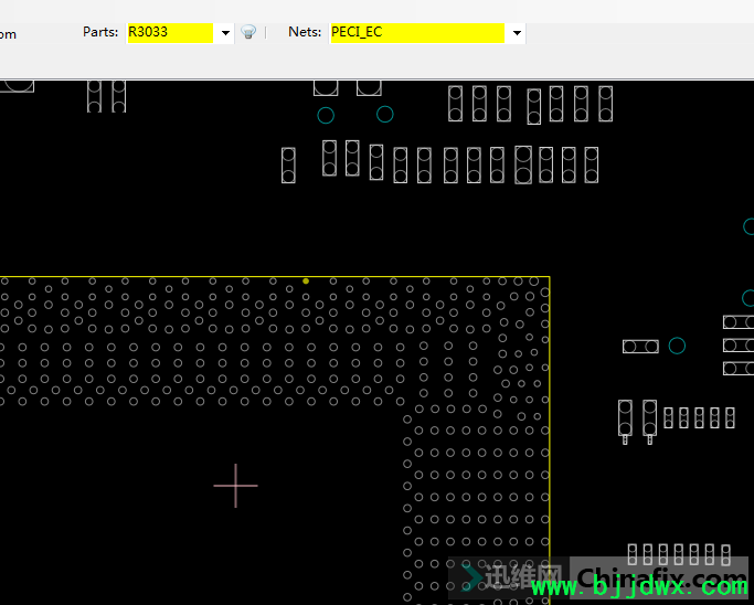 马上在点位图的Nets栏搜PECI,发现有PECI_EC和PECI_EC_R两个型号,点开一看PECI_EC在CPU上,PECI_EC_R在EC的117脚,中间就一颗43欧姆的电阻R3033。