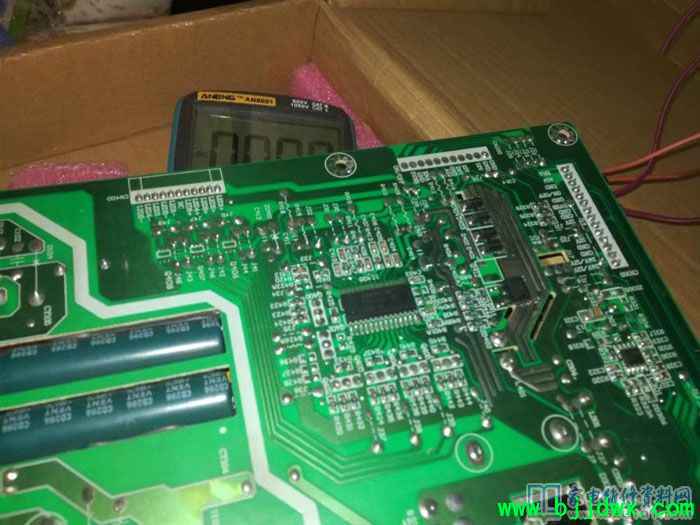 注:在测6脚时屏变亮,测7脚时屏变暗。测4脚时万用表10V和2.5V档测出的数字会不同。测1脚和16脚电压可以直接测电路板正面的二极管D702和D703的负极。应该有3.5V电压差不多,因此怀疑芯片损坏,这个板反正只是拿 来研究,这个芯片坏了算了,放弃维修。