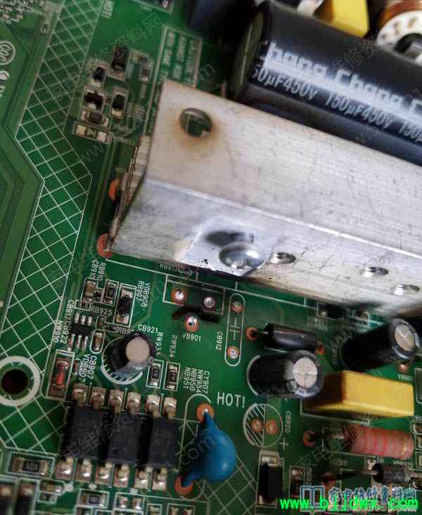 接修一台康佳LED50K35U液晶电视,故障表现为指示灯不亮,此机采用的是35022316板(三合一板),拆机检查发现VB901场效应管一条腿已烧断,CB912瓷片电容已开裂,散热片下一玻封二极管也已开裂,尖峰吸收电容坏。最后更换了保险丝、7N65C(没有买到4N65F)、3.9V稳压二极管和尖峰吸收电容后故障修复。