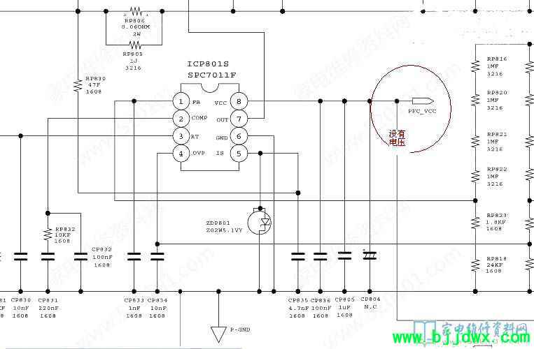摘板测量各组输出电压正常稳定,输出电流接近正常值,仔细看看有PFC电路,怀疑此电路没工作,测量大电容305V,故障点找到,根本没升压,找图纸仔细测量SPC7011F的8脚没供电。顺藤摸瓜找到变压器绕组断路。 情急之下拆了重绕,一共9圈好绕。绕好变压器装回正常工作,SPC7011供电有13V了,大电容390V了,接上试机一切正常。