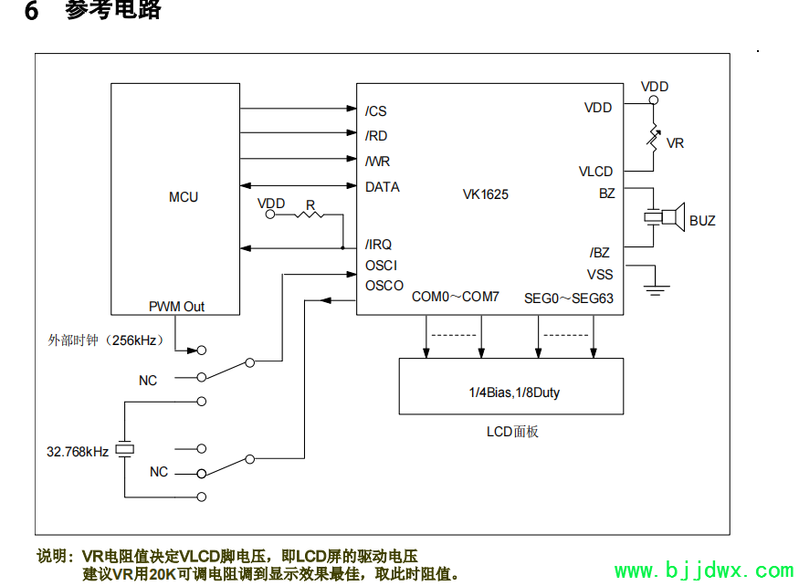 VK1625是一个点阵式存储映射的LCD驱动器,可支持最大512点(64EGx8COM)的LCD屏。单片机可通过3/4线串行接口配置显示参数和发送显示数据,也可通过指令进入省电模式。 HCH429