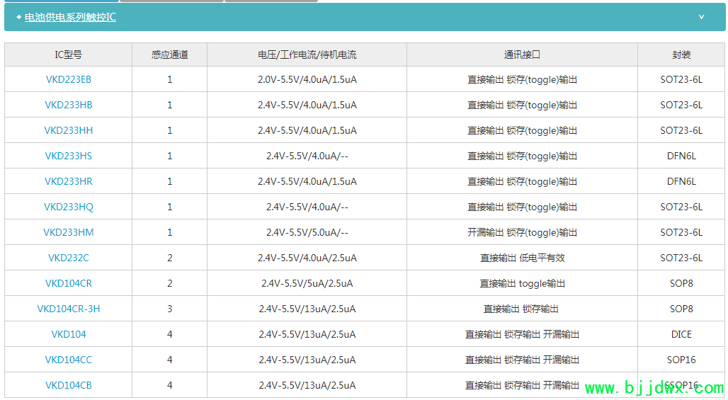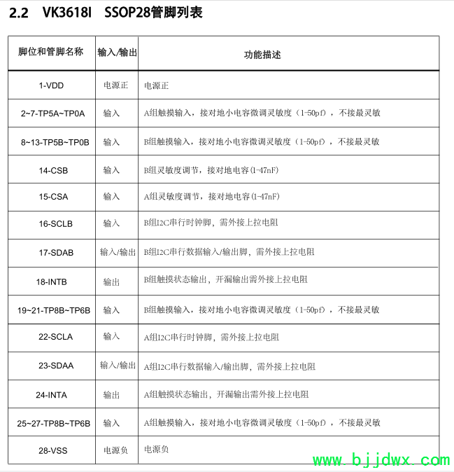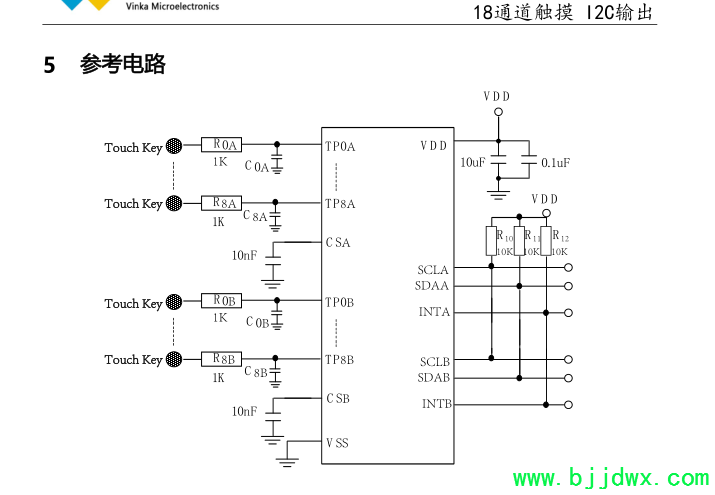 VK3618I具有18个触摸按键,可用来检测外部触摸按键上人手的触摸动作。该芯片具有较高的集成度,仅需极少的外部组件便可实现触摸按键的检测。提供了2I2C输出功能,1INT中断输出脚,2I2C脚和INT可并联,每组单键输出,有效键对应数据位置1。芯片内部采用特殊的集成电路,具有高电源电压抑制比,可减少按键检测错误的发生,此特性保证在不利环境条件的应用中芯片仍具有很高的可靠性。此触摸芯片具有自动校准功能,低待机电流,抗电压波动等特性,为各种触摸按键+I2C输出的应用提供了一种简单而又有效的实现方法。