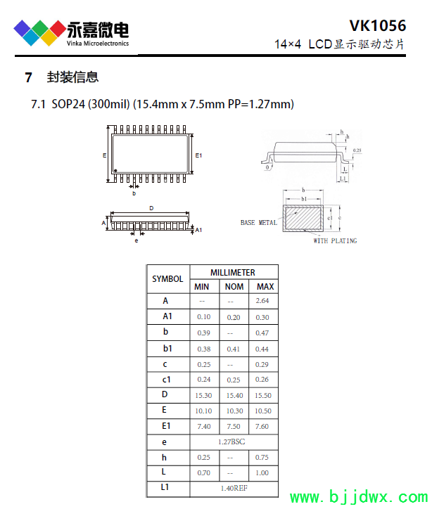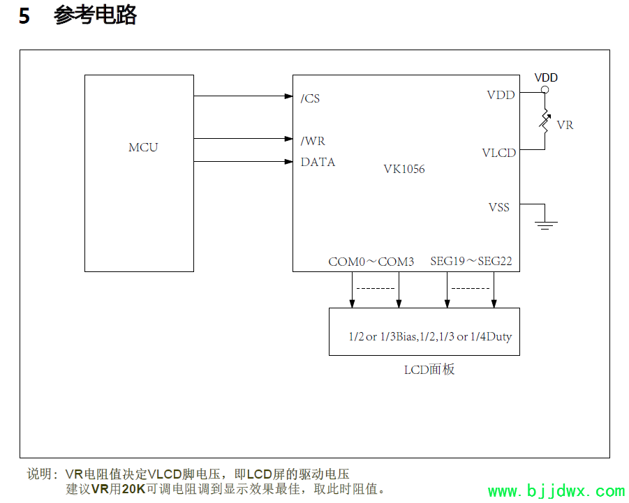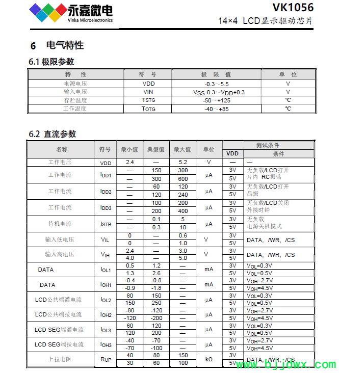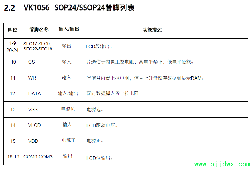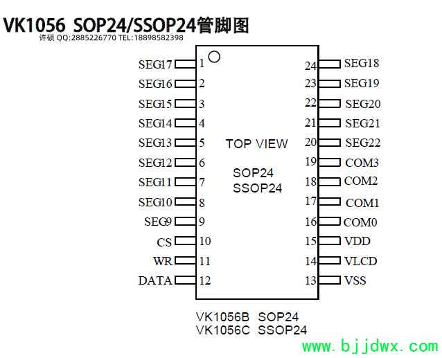 VK1056B/C 是 56 点、 内存映象和多功能的 LCD 驱动, VK1056B 的软件配置特性使它适用于多种 LCD 应用场合,包括 LCD 模块和显示系统,用于连接主控制器和 VK1056B 的管脚只有 4 条, VK1056B 还有一个节电命令用于降低系统功耗。