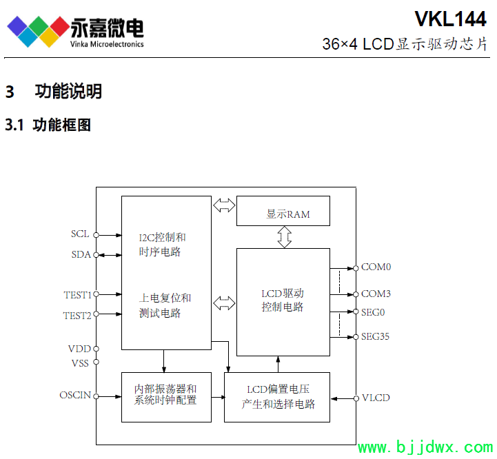 VKL144A/B是一个点阵式存储映射的LCD驱动器,可支持最大144点(36SEGx4COM)的LCD屏。单片机可通过I2C接口配置显示参数和读写显示数据,可配置4种功耗模式,也可通过关显示和关振荡器进入省电模式。其高抗干扰,低功耗的特性适用于水电气表以及工控仪表类产品。