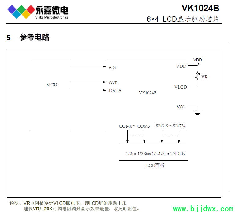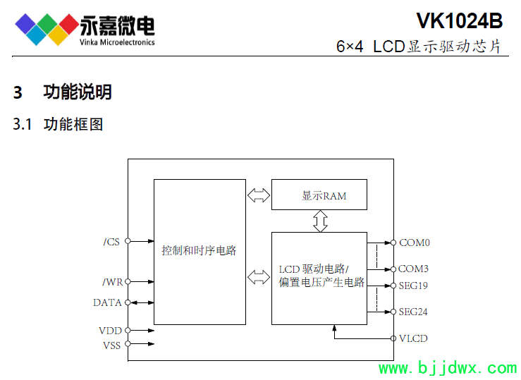 VK1024B 是 24 点、内存映象和多功能的 LCD 驱动, VK1024B 的软件配置特性使它适用于多种 LCD 应用场合,包括 LCD 模块和显示系统,用于连接主控制器和VK1024B 的管脚只有 4 条,VK1024B 还有一个节电命令用于降低系统功耗。
