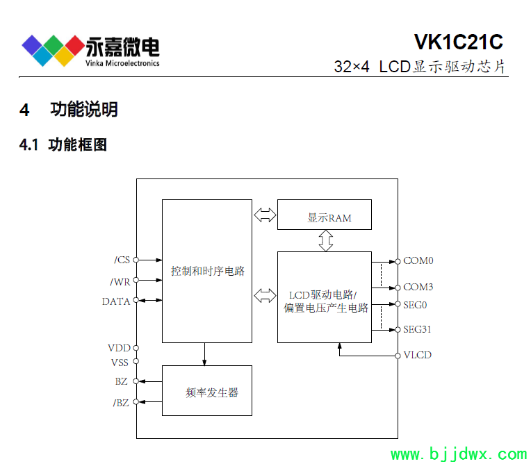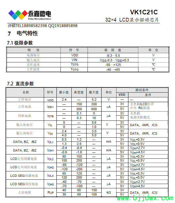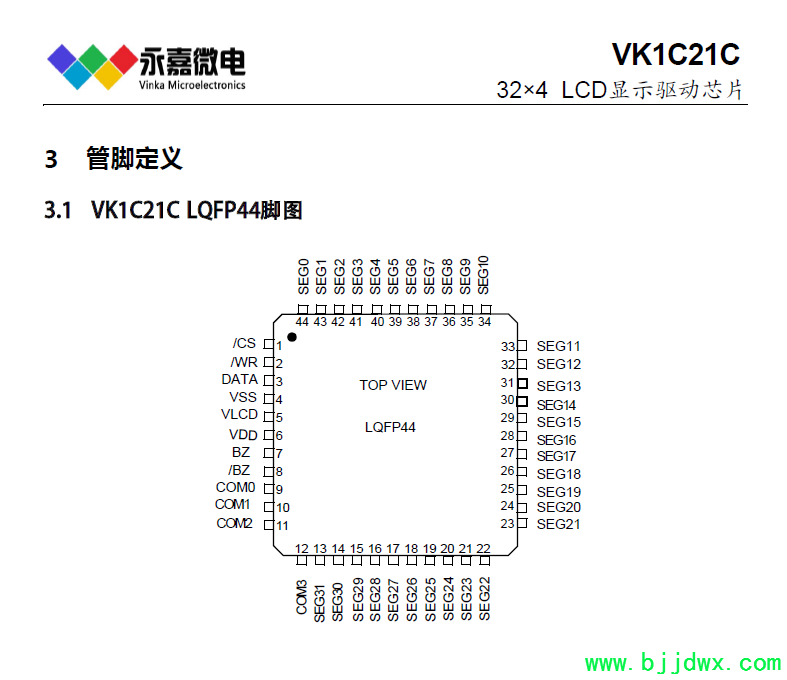 VK1C21C是一个点阵式存储映射的LCD驱动器,可支持最大128点(32SEGx4COM)的LCD屏,也支持2COM和3COM的LCD屏。单片机可通过3个通信脚配置显示参数和发送显示数据,也可通过指令进入省电模式。具备高抗干扰,显示效果好,静电耐压高等优良特性,可替代市面上大部分LCD驱动芯片。