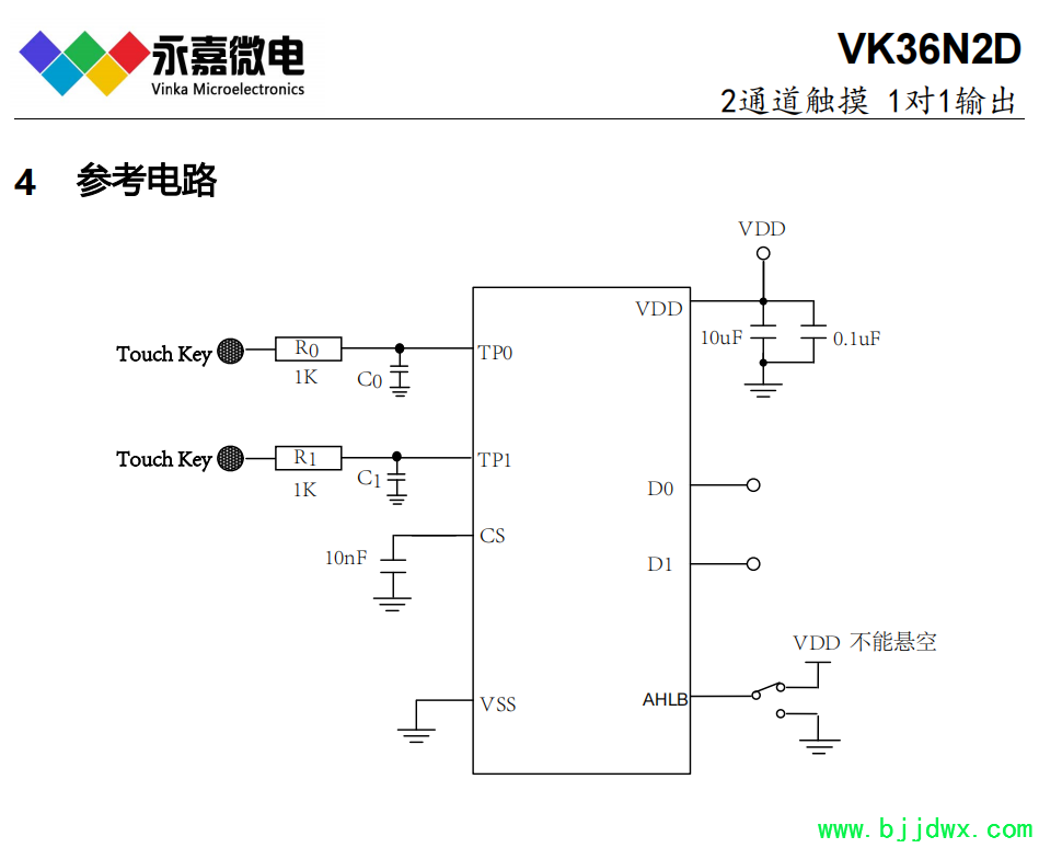 VK36N2D具有2个触摸按键,可用来检测外部触摸按键上人手的触摸动作。该芯片具有较高的集成度,仅需极少的外部组件便可实现触摸按键的检测。