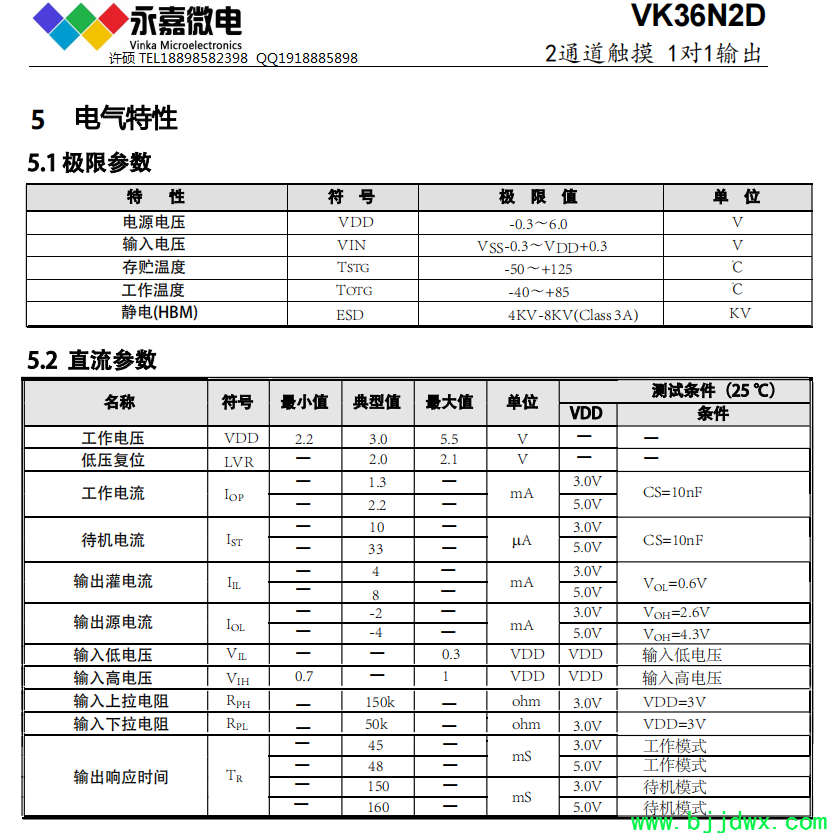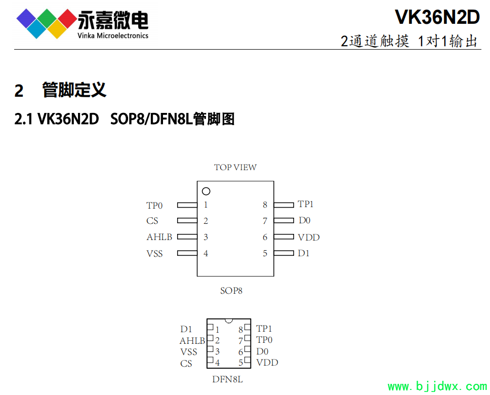 VK3602K/KA 工作电压/待机电流:2.4V-5.5V/8μA(3V) 感应通道数:2 输出方式:直接输出 抗干扰/待机电流小,抗电源及手机干扰 封装:SOP8