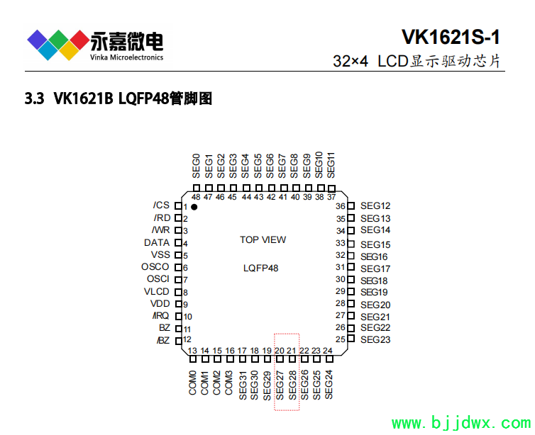 VK1626 2.4V~5.2V 48seg×16com 偏置电压1/5 LQFP100/QFP100;DICE/DIE (绑定COB) 省电模式