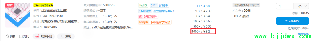 然后CA-IS2092A这个芯片的价格也很合适,大概批量可以做到6块钱左右,性价比很高,要知道一个普通的RS485非隔离芯片也要1块钱左右,加上隔离电源模块也得3块钱左右,还有数字隔离器也差不多2块钱左右。而这个CA-IS2092A一颗芯片就搞定了,体积小,而且价格便宜,性价比很高:
