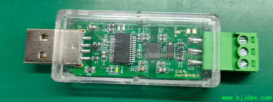 然后我拿示波器的普通探头去看RS485的A对B的波形(B接到示波器的地夹子),然后示波器的地夹子也是大地,于是自然也没看到正常的波形,而且我设备的RS485通讯也异常了。我感觉很无语,所以我感觉我需要一个隔离型的USB转RS485转换器!!下图是我当前用的非隔离型的USB转RS485的转换器(也很好用,美中不足就是非隔离)。