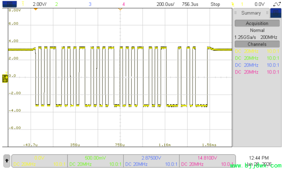 实测通讯效果也是非常的棒,下图是波特率为38400的通讯波形,我实测了一下1w个数据采集和写入均没有丢包:
