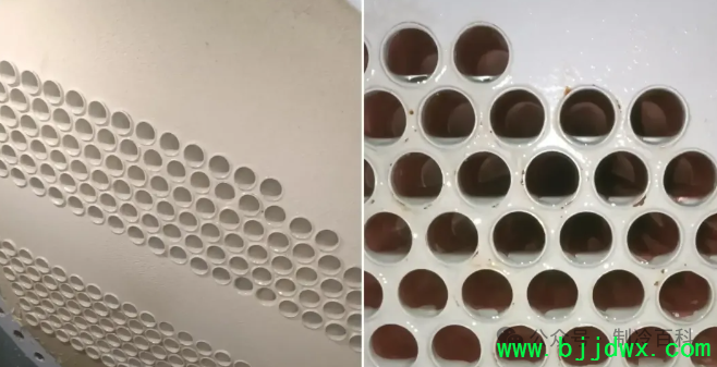 硬垢主要是由冷却水中溶解的钙盐和镁盐,在经过加热后析出并沉积于换热表面所造成的。当含有较高浓度钙镁离子的硬水作为冷却介质时,随着水流过冷凝器内的铜管,水温上升导致溶解度下降,碳酸根与钙镁离子结合形成不溶性的碳酸钙或氢氧化镁等化合物,并附着在冷凝器内部的换热面上。尤其是在换热管弯曲处,由于局部流速变化容易造成矿物质沉淀,进而加速结垢过程。因此,在有条件的情况下,建议通过前置处理去除钙镁离子,以减缓结垢速度,并维持定期清洗保养。