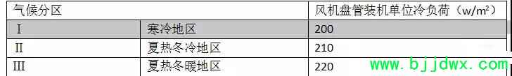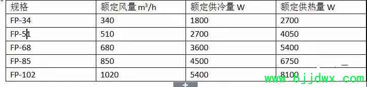 4.1、确定风盘型号:风机盘管请参考厂家的产品型号,注意盘管的排管数量和接管方式。当较大规格的风机盘管噪音不能满足房间要求时,应取多台小容量盘管。风机盘管容量按照下表选择。