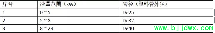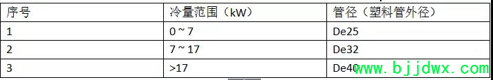 4.2、风盘接管管径:风机盘管接管管径根据末端风机盘管的冷量累计值,按下表确定。