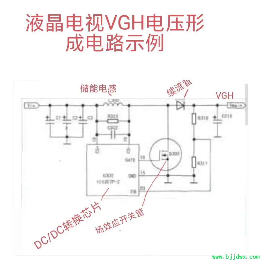根据这些特点,用万用表二极管档检测其关键元件好坏。在该机中,VGH形成电路的场效应开关管Q300外置,采用BOOST拓扑结构。