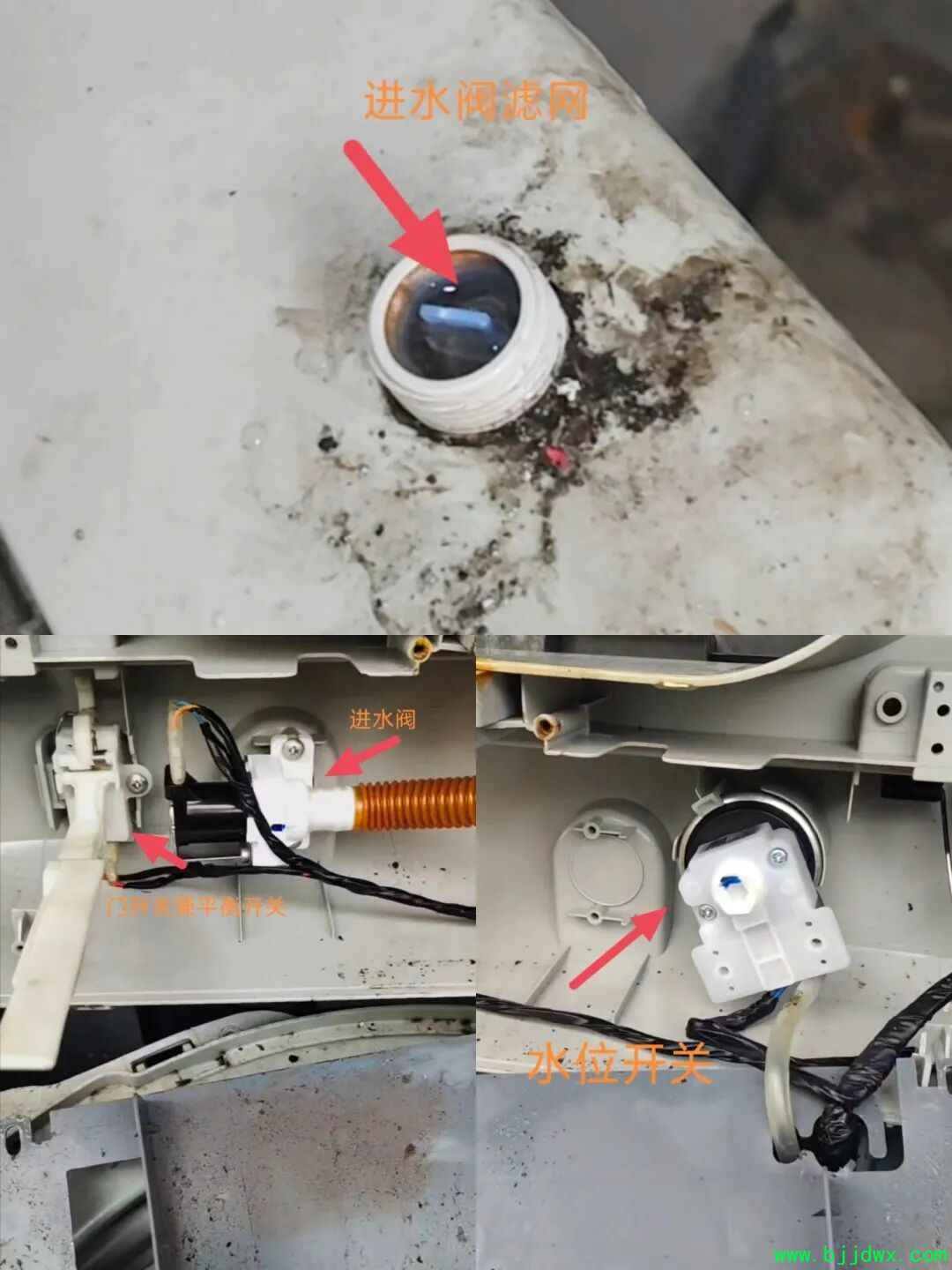 - 水满不停机:别盯着进水阀了,是水位传感器故障,导致感应不到水位,一直持续进水。