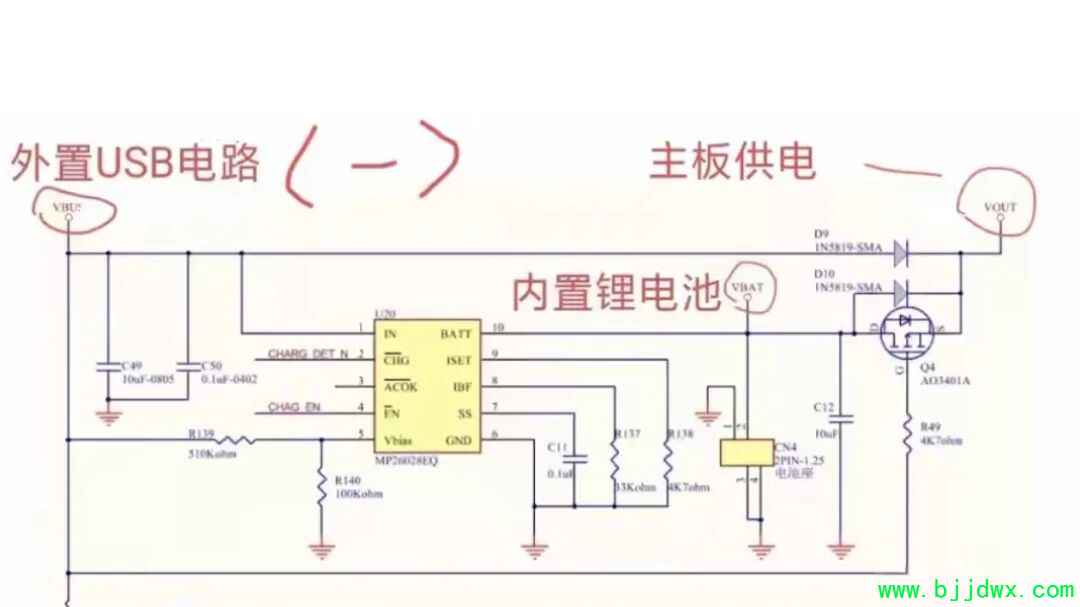 无外置USB电压时,锂电池电压通过二极管D10到达Q4源极(S),栅极(G)通过电阻R49、R155下拉到地,使Q4导通,此时D10又转为截止,锂电池电压通过Q4沟道输出,给手机等主板供电。