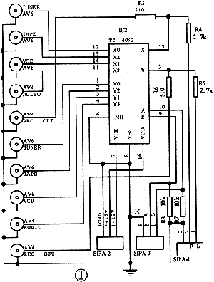 排除了电源干扰之后,还得考虑从音频输入端窜入的干扰。查VCD音频输出端,在开机瞬间有较大幅度的尖锋脉冲输出(很多VCD机均有此现象)。拔除VCD到AV-737所有的信号连线,试机果然正常。于是顺藤摸瓜,检查功放的输入选择电路。奇声AV-737所附的电原理图中,由于篇幅有限,输入选择电路只简单地画了一个象征性的开关选择电路,而实际是电子开关选通电路(如图1所示)。仔细检查,发现电子开关集成电路TC4052的电源地与音频信号地相连,同时又通过其A、B电平控制线的屏蔽线与CPU的地相连。拔下SIPA-3插头,试机,没有出现上述故障,说明干扰信号是通过此屏蔽线窜入CPU电路的。从整机原理分析,此屏蔽线只是起A、B控制线的屏蔽作用,避免控制电平受到干扰而自动切换输入选择。于是,在图1中的“×”处断开屏蔽线与音频信号地相连接的铜箔,插好SIPA-3插头,试机,故障排除。多台出现此故障的AV-370功放经过这样修理后,至今工作正常。