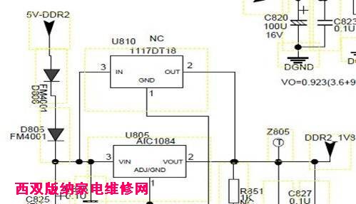开机检测电源板有12V、24V输出,说明待机CPU U002(WT6702F)基本正常,只是主芯片U201 (MST6M68FQ) 没有正常工作,没有发出背光点亮信号与屏供电控制信号。检测U201工作条件发现无1.8V供电,该供电由三端稳压U805提供,查U805输入脚无3.6V电源进入。最后查出是1.8V供电延迟电路,R857开焊使Q807、Q806截止,造成U805无输入电压无法产生1.8V.补焊R857故障排除。如果该电路Q806坏无备件应急情况下也可直接取消Q806,短路L804处理.