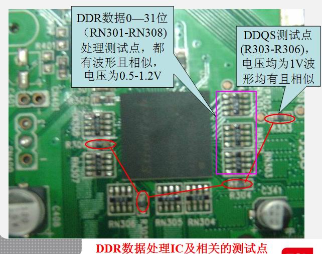 B、满屏密竖条干扰,故障为U301与U302相互处理的数据存储信号DQS0-3其中一路异常,因每一路DQS控制8位的数据处理,同样可测试其波形与电压判定,正常时测试点电压为1V左右,且都有相似的波形,若异常肯定无波形或电压异常为2.5V,可将其对应传输电阻(R303-R306)断开后测量其两端电压,正常均为1V,且都有波形,哪端异常可判定与其相连的IC工作异常,此时需测量该IC的供电及其工作条件是否满足后再更换IC。