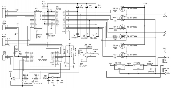 图2是一种高效低速稀土永磁无刷电机的结构,电机的转动部分是转子,与普通电机不同,这种电机的绕组在定子上,而转子上嵌有三组稀土制成的高磁强永磁体,一般为24块,它的磁场强度决定了电机的效率和驱动力的大小,所以用户不要随意打开电机,不仅由于定子与转子之间的磁力很大卸开后没有专用工具很难装好,而且定子卸走后会使磁钢退磁,从而降低了电机的性能。定子上绕有绕组的铁芯及用于固定到车架的空心轴,在定子的边缘装有三个霍尔器件作为转子的位置传感器。所有接线都从固定轴的中孔中引出。引出线分两组,比较粗的一组是电机的驱动线,用来驱动电机。要求能持续通上10A并在瞬时有通过30A电流的能力。这一组三条线A、B、C分别连接到星形连接的三相电机绕组的接线端。另一组接线通常连在一个5线插头上(虽然目前还没有一个标准,但为了能使各种电机与不同厂家的控制器相接或者说为了使各种控制器能与不同厂家的电机相连接,这些连接器的规格、定义都在靠拢。),该组接线用于检测绕组的位置,其中1为检测器电源,通常为12V或5V,5为地,2、3、4为绕组相应的霍尔位置检测器的输出a、b、c,它们与绕组的响应关系用颜色标记(例如2(a)是红色,则红色的粗线为A),在控制电路中通常采用三相全波式供电,对a、b、c三种信号的组合进行译码后向六个功率管提供驱动信号来驱动无刷电机。为了让大家对电动自行车的电机有一个概念,附表给出一些电动自行车的电机数据。 3.电源 电动自行车几乎都用能多次充电的蓄电池作为能源,目前使用的有全封闭免维护铅酸蓄电池、镉镍电池、镍氢电池、锂电池、燃料电池等。由于全封闭免维护铅酸蓄电池在价格上有较大的优势,所以绝大多数电动自行车使用这种电池。电动自行车上将电池串联成电池组安装在专用的电池盒中,每个电池的容量通常为12安时(大的有18安时)。 这种电池的寿命约为500次放电(寿命与电池质量与使用方法有很大关系),因此使用电动自行车时的日常费用决不能只考虑使用的电费,而要把一年要换一次的蓄电池的费用考虑进去(约400元)。 4.电动自行车的控制器 电动自行车的控制器用于控制电动自行车的运行,从功能上来看,它单单只是使电动自行车能够起停,总的要求有: 运行控制:使电动自行车的速度能按照手把转动的角度发生变化从零速度到最大速度; 具有电流过载保护功能,在各种运行状态电流都不超过保护值; 过热保护:当电动自行车长期运行在额定电流状态控制器温度过高时切断电源供应; 刹车时自动断开供电电源; 欠压保护:当电源供电不足电池电压下降到电池最低电压时切断电源,以保护电池。酸铅电池不怕充足就怕没电。 其它功能:为提高使用性能,电动自行车常附带有一些其它功能。非零启动功能是为了防止起动电流过大,具有该功能的自行车只有当电动自行车的车速大于某一速度(例如5公里/小时)后控制才起作用,以保护蓄电池,使蓄电池不在大电流放电状态下工作;软起动的目的同前,使电动自行车工作电流保持恒定,使蓄电池不在大电流放电状态下工作;保持功能是使电动自行车的运行速度在手把给定的最大速度运行,以减轻长途骑行时的疲劳,即你骑行时将车速增加到某个速度运行时,可放开手把,自行车则维持在该速度上运行,若要增加速度则可通过增加手把转角,但要降低车速则必须使用刹车解除来保持状态;1:1功能是电动自行车行业的一个行话,实际上是一种助力功能,即电动自行车在比较轻松的骑行中运行,以使电池处于比较省电而骑行又比较省力,实际上真正要做到1:1功能需要在脚蹬上加力的传感器,根据传感器信号来控制供给电机的电流,但现在很多控制器的1:1功能仅仅是给电机一个固定的控制电压,因此在上桥或迎风的时候,还会感到比较累。 下面以一个具体的控制器为例来说明电动自行车控制器的原理。图3为某种电动自行车控制器电原理图。在图中16V8为译码器,将霍尔元件检测出来的换相信号转换为六个驱动功率管的控制信号;IR2136为无刷电机专用控制电路,为驱动功率管提供驱动信号;P87LPC767是带有AD输入及PMW输出的单片机,它将手把的电平信号转换为脉冲调宽信号,同时完成诸如过载保护、欠压保护、保持、非零启动等功能;LM358用于过载电流的放大;电动自行车的电源电压为36V,而IR2136需要15V供电,单片机需要5V供电,因此使用7815、7805提供15V与5V电源;T1~T6(IRFZ44N)为六个N通道功率场效应管,接成三相全波电路,为三相电机绕组供电(RO1、YO1、BO1)。